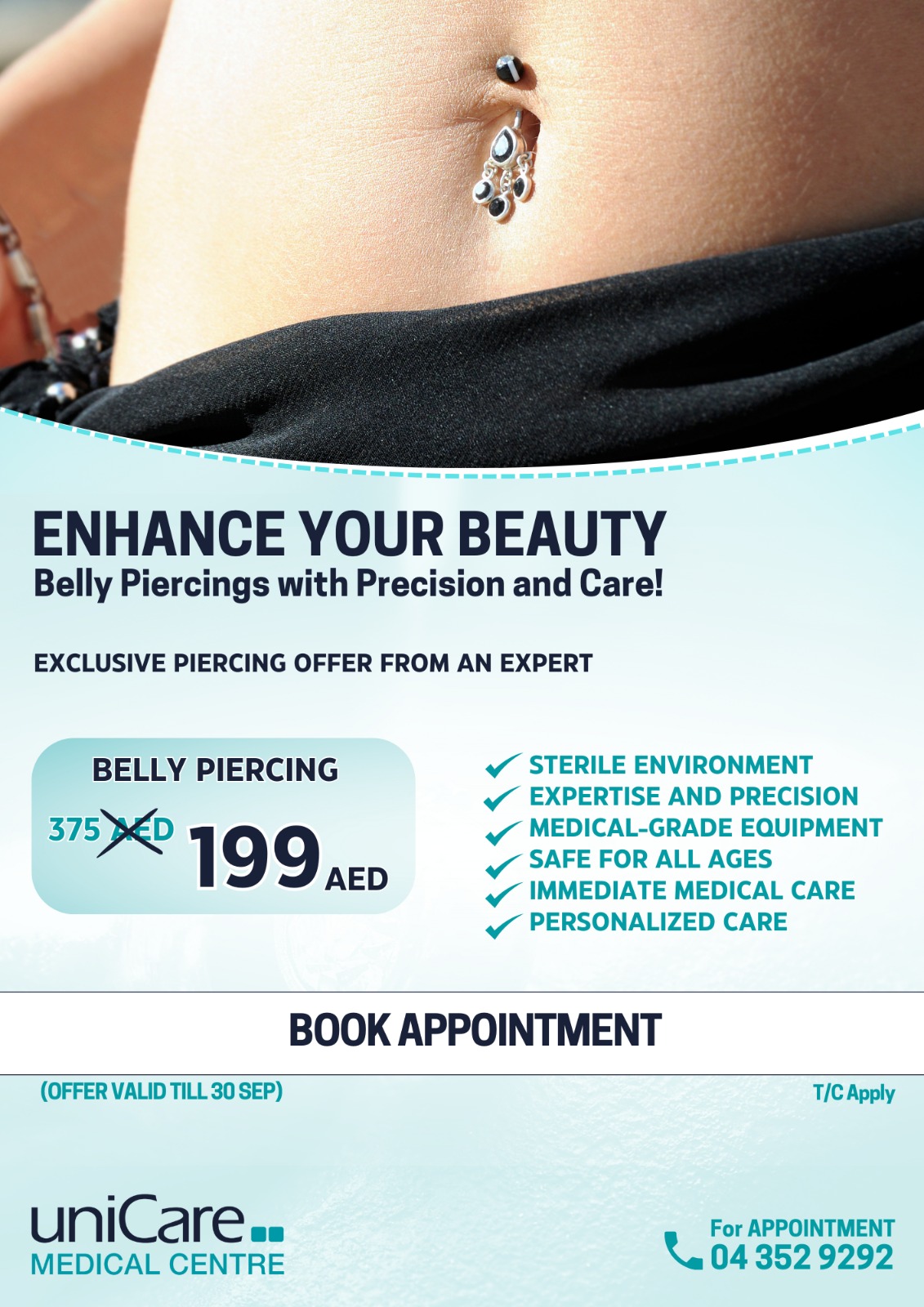 Ear , Nose , Belly bottom piercing offer present in uniCare medical center Burjuman, for booking call canter and book to Dr R Safarini